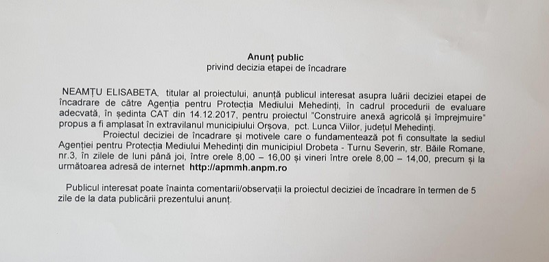 ANUNT PUBLIC PRIVIND DECIZIA ETAPEI DE INCADRARE NEAMTU ELISABETA